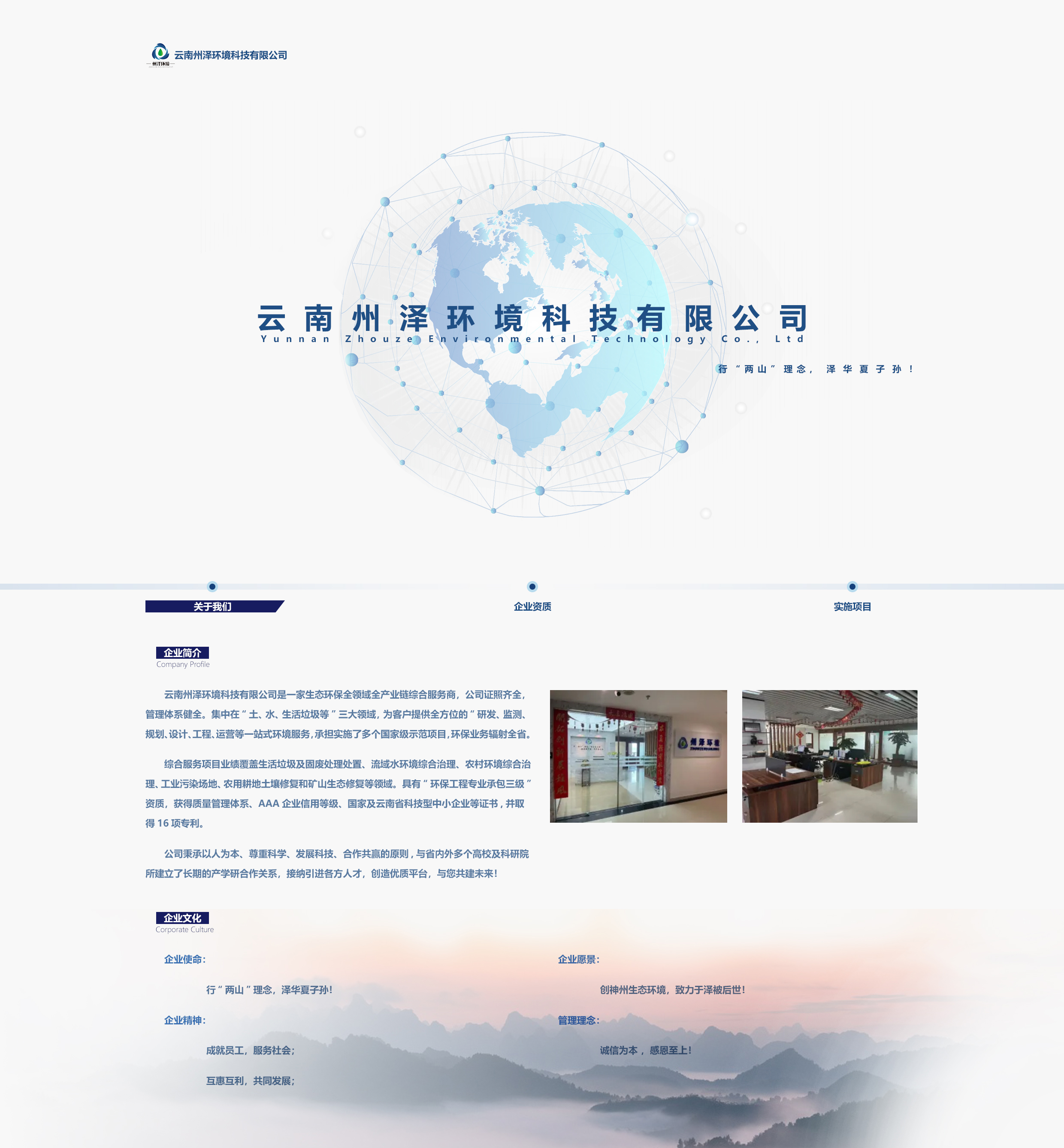云南州澤環(huán)境科技有限公司是一家生態(tài)環(huán)保全領(lǐng)域全產(chǎn)業(yè)鏈綜合服務(wù)商,公司證照齊全,管理體系健全。集中在“土、水、生活垃圾等”三大領(lǐng)域,為客戶提供全方位的“研發(fā)、監(jiān)測、規(guī)劃、設(shè)計、工程、運營等一站式環(huán)境服務(wù),承擔實施了多個國家級示范項目,環(huán)保業(yè)務(wù)輻射全省。